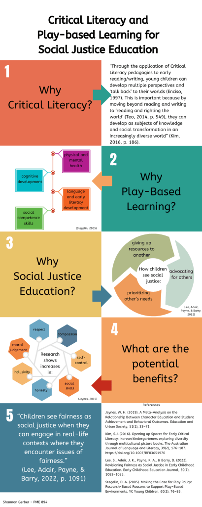 Social justice is something that is incredibly important to me, and helping young students to learn more about themselves and others is my passion. Young children face real challenges in their own lives, and in how they relate to others. My goal has been to use picture books and hands-on play/art experiences to teach about topics such as racism, truth and reconciliation, gender equality and stereotypes, personal identity, immigration, diverse families, and religious diversity. As the capstone project for my Professional Master of Education degree through Queen’s University, I have created a series of scaffolded lesson plans on each chosen topic, based on different quality picture books for each grade level, with suggested discussion prompts and play-based activities that teachers can implement without spending too much (or any) money out-of-pocket…and even more importantly, without creating any more “drama and trauma” with their school community!